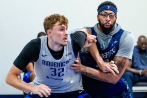 體育資訊10月8日訊 今天,獨(dú)行俠官方曬出了球隊(duì)訓(xùn)練照。其中,弗拉格和安東尼-戴維斯激烈卡位。