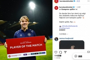 體育資訊10月10日訊 丹麥國家隊官方宣布,霍伊倫當選6-0白俄羅斯的球迷票選最佳球員。