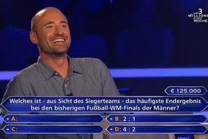 體育資訊10月11日訊 在德國版的《誰想成為百萬富翁》智力競賽節(jié)目中,一位參賽者沒能回答對(duì)世界杯決賽的比分,錯(cuò)失12.5萬歐元(約103萬人民幣)獎(jiǎng)金。