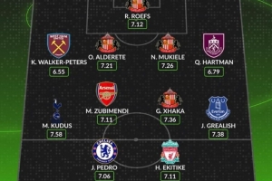 中場(chǎng):庫(kù)杜斯(熱刺,7場(chǎng)1進(jìn)球5助攻)、蘇維門迪(阿森納,7場(chǎng)2進(jìn)球)、扎卡(桑德蘭,7場(chǎng)3助攻)、格拉利什(埃弗頓,7場(chǎng)1進(jìn)球4助攻)