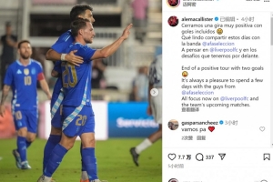 麥卡利斯特社媒曬出比賽照片,并寫道:“以兩粒進球結(jié)束了積極的國際比賽日之旅,與國家隊伙伴們共度數(shù)日時光總是令人感到愉快?!?/p>