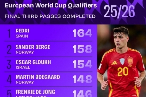 歐洲世預(yù)賽進(jìn)攻三區(qū)成功傳球榜:
