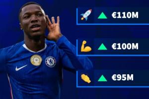 凱塞多目前身價為9000萬歐,此次更新最高將漲至1.1億歐,成為英超第10位億元先生,最低將下跌至8500萬歐。