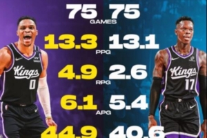 威少上賽季出戰(zhàn)75場,場均13.3分4.9板6.1助攻,三項命中率44.9/32.3/66.1%