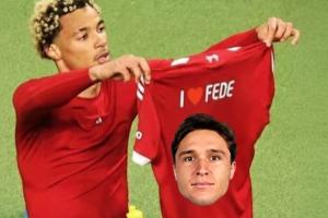 ?;倏藭癯鲎约涸趯﹃嚹习财疹D的比賽中脫衣慶祝的照片,并在球衣上加上了小基耶薩的頭像,并配文“我??費德(費德里科-基耶薩的昵稱)”。