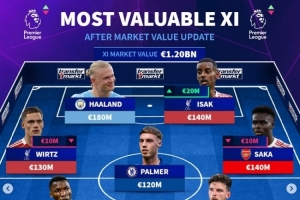體育資訊10月18日訊 德轉(zhuǎn)在本月17日更新英超球員身價(jià),同時(shí)列出英超球員身價(jià)最貴陣,哈蘭德、維爾茨、伊薩克在列,總身價(jià)達(dá)12億歐。