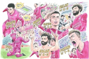 他的插圖將利物浦那場歷史性比賽中的七次慶祝畫面與歡騰的安菲爾德球場背景相結合。 球迷們很快就能在即將推出的安菲爾德球場新講談社角(Kodansha Corner II)近距離欣賞到這幅獨特的作品。