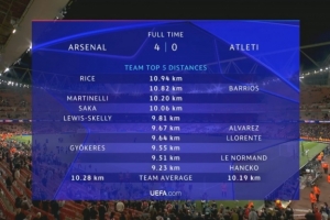 賽后兩隊(duì)跑動(dòng)數(shù)據(jù)顯示,阿森納全隊(duì)平均跑動(dòng)距離為10.28KM略高于馬競的10.19KM。但是,在跑動(dòng)距離超過10KM的球員中,阿森納有3人,分別為賴斯(全場最高10.94KM)、馬丁內(nèi)利和薩卡,而馬競僅有1人為巴里奧斯。