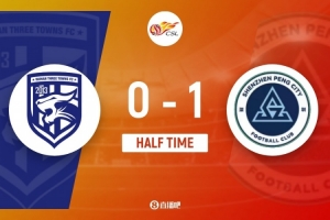 傷停補(bǔ)時5分鐘。上半場比賽結(jié)束,武漢三鎮(zhèn)0-1深圳新鵬城。