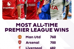 體育資訊10月27日訊 在本輪英超,阿森納1-0擊敗水晶宮,達成隊史第700場英超勝利。以下為英超歷史勝場數(shù)榜: