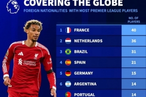 體育資訊10月27日訊 《轉(zhuǎn)會(huì)市場(chǎng)》統(tǒng)計(jì)了當(dāng)前英超的各國(guó)外援?dāng)?shù)量,法國(guó)球員多達(dá)40人。
