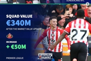 各大聯(lián)賽身價(jià)漲/跌最多隊(duì):桑德蘭、科莫大幅上漲,曼城-2千萬(wàn)
