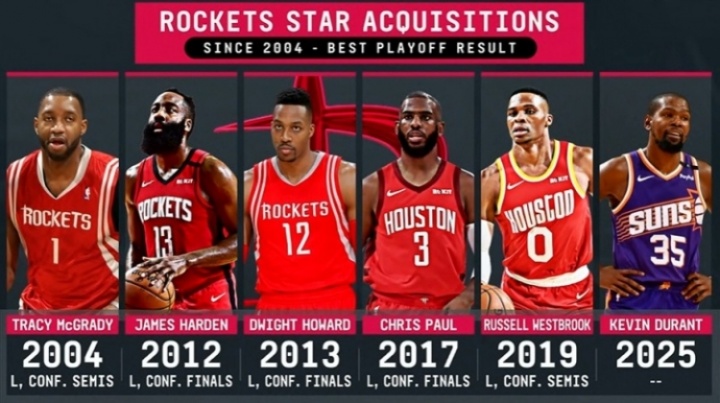 體育資訊07月20日訊 官方轉(zhuǎn)播曬出了火箭21世紀以來球隊做的球星交易以及他們帶領(lǐng)球隊在季后賽達到的最好成績: