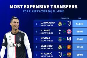 30歲以上球員轉(zhuǎn)會費(fèi)榜:C羅33歲1.17億歐居首 凱恩內(nèi)馬爾分列二三