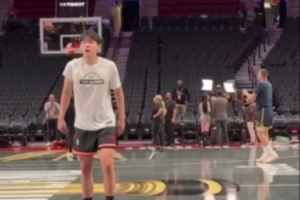 開拓者官推曬楊瀚森和約老師同場熱身視頻:訓(xùn)練直到偶像成為對手