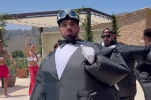 體育資訊7月10日訊 據(jù)《太陽報》報道,阿森納門將大衛(wèi)-拉亞與女友塔蒂亞娜在西班牙舉行了婚禮,他身穿充氣燕尾服與伴郎團搞笑入場。