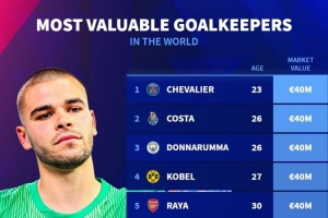 體育資訊11月1日訊 德國轉(zhuǎn)會(huì)市場統(tǒng)計(jì)了門將的身價(jià),并列出榜單,多納魯馬、科貝爾、拉亞等5人并列居首。