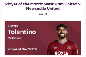 體育資訊11月3日訊 英超第10輪西漢姆聯(lián)主場3-1擊敗紐卡,據(jù)賽后英超官方消息,帕奎塔被評為此役全場最佳球員,獲43%的投票。