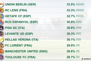 反擊打法!五大聯(lián)賽攻防轉(zhuǎn)換占比排名:柏林聯(lián)合居首,曼聯(lián)第9位