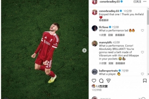 布拉德利當選本場比賽利物浦隊內(nèi)最佳球員,賽后他在社交媒體上曬出照片,配文:“享受這場比賽,謝謝安菲爾德?!?/p>