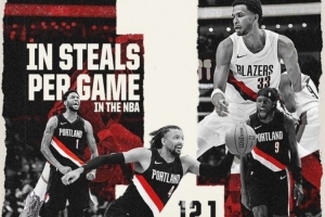 體育資訊11月5日訊 開拓者官方發(fā)布數(shù)據(jù)海報(bào),球隊(duì)場(chǎng)均送出12.1次搶斷,排名聯(lián)盟第一。