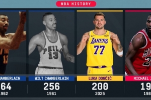 在賽季的前五場比賽中,東契奇合計(jì)得到200分,歷史第三高,僅次于張伯倫,詳情如下:
