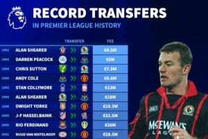 德轉(zhuǎn)列英超歷史轉(zhuǎn)會費紀錄變化: