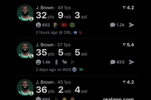 過(guò)去5場(chǎng)比賽,布朗四次砍下30+,賽季至今,他場(chǎng)均砍下28.1分。
