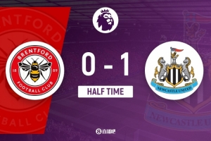 傷停補(bǔ)時(shí)5分鐘。上半場(chǎng)比賽結(jié)束,布倫特福德0-1紐卡斯?fàn)柭?lián)。