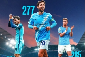 本場比賽也是B席第277次代表曼城在英超出場,升至隊史第三位,僅次于席爾瓦的309場以及德布勞內(nèi)的285場。