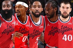 本賽季快船最常用的陣容是哈登、比爾、小瓊斯、萊昂納德和祖巴茨組成的首發(fā)陣容。這陣容在9場比賽中出場63分鐘,進(jìn)攻效率120.9,防守效率為131.8,凈效率為-10.9。