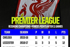 體育資訊11月10日訊 在本輪英超,利物浦0-3不敵曼城,11輪過(guò)后只得到18分,OPTA也盤(pán)點(diǎn)了英超歷史衛(wèi)冕冠軍在前11輪過(guò)后最少積分情況,本賽季利物浦排在第四,具體如下: