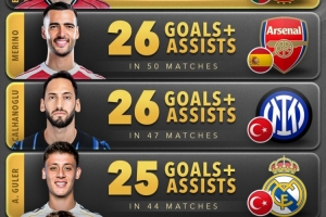 2025年中場參與進球榜:B費28球居首,梅里諾、恰爾汗奧盧26球