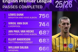 本賽季英超成功傳球榜:范戴克第二,中場僅安德森、蘇維門迪