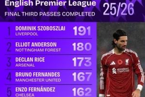 本賽季英超進(jìn)攻三區(qū)成功傳球榜: