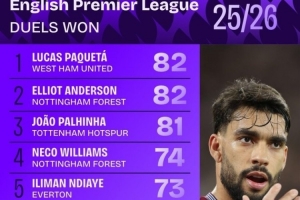 本賽季英超成功對(duì)抗榜:帕奎塔、安德森、帕利尼亞分列前三