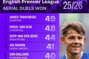 體育資訊11月11日訊 英超聯(lián)賽已經(jīng)進(jìn)行了11輪,squakwa也統(tǒng)計(jì)了本賽季英超空中成功對(duì)抗次數(shù),塔科夫斯基力壓范戴克居首。