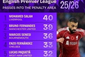 本賽季英超傳球入禁區(qū)次數(shù)榜:薩拉赫壓B費居首,恩佐、扎卡在列