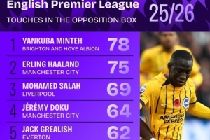 本賽季英超在對(duì)方禁區(qū)內(nèi)觸球榜: