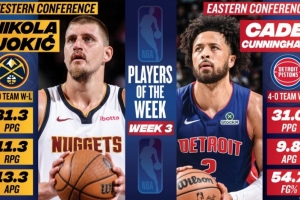 周最佳:約基奇場(chǎng)均31.3分11.3板13.3助大號(hào)三雙 CC率隊(duì)4勝0負(fù)