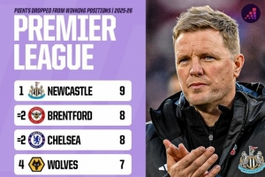 體育資訊11月11日訊 Opta統(tǒng)計了本賽季英超球隊領(lǐng)先之后丟掉的積分,并列出榜單,紐卡9分最多,布倫特福德、切爾西8分次席。
