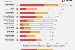 本賽季西甲參與有效進(jìn)攻排名:姆巴佩106次居首,佩德里89次第二