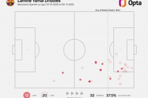 體育資訊11月12日訊 據(jù)Opta統(tǒng)計,10月份國際比賽日之后,亞馬爾是五大聯(lián)賽同期嘗試過人次數(shù)最多的球員。