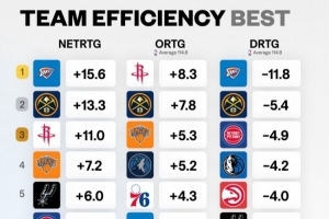 各隊(duì)凈效率&攻防效率排名!凈效率&防守效率雷霆第1 進(jìn)攻火箭第1