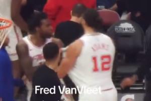 昨日第三節(jié)結(jié)束,伊森和亞當(dāng)斯有些沖突,互相拉拽球衣,火箭助教迅速介入拉開雙方。火箭其他球員也有些懵……
