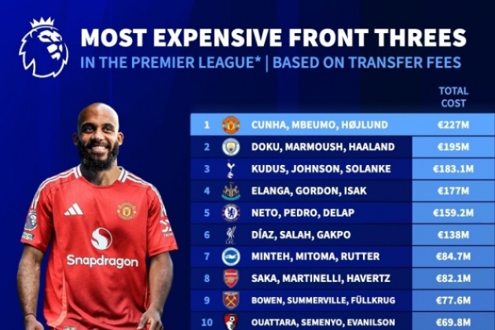 體育資訊07月22日訊 德轉今日盤點了英超各隊鋒線三叉戟的轉會費排名,其中曼聯(lián)以2.27億歐居首,曼城1.95億歐第2。