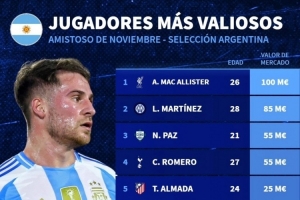 體育資訊11月15日訊 德國轉(zhuǎn)會市場統(tǒng)計了本期阿根廷隊名單的球員身價,麥卡利斯特1億歐居首,梅西1800萬歐排名第9位。