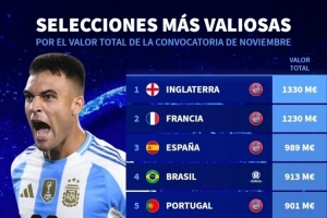 本期國(guó)家隊(duì)身價(jià)榜:英格蘭、法國(guó)、西班牙前3,阿根廷第9