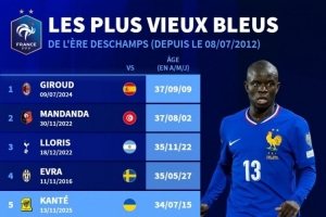 體育資訊11月15日訊 世預賽歐洲區(qū)比賽,坎特踢滿全場,幫助法國主場4-0擊敗烏克蘭,德轉(zhuǎn)列出了德尚執(zhí)教法國隊以來年齡最大出場球員排名,吉魯居首,坎特排在第5位。