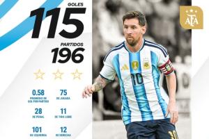 梅西國家隊(duì)生涯196場打進(jìn)115球,仍居國家隊(duì)歷史射手榜第二,榜首C羅143球。